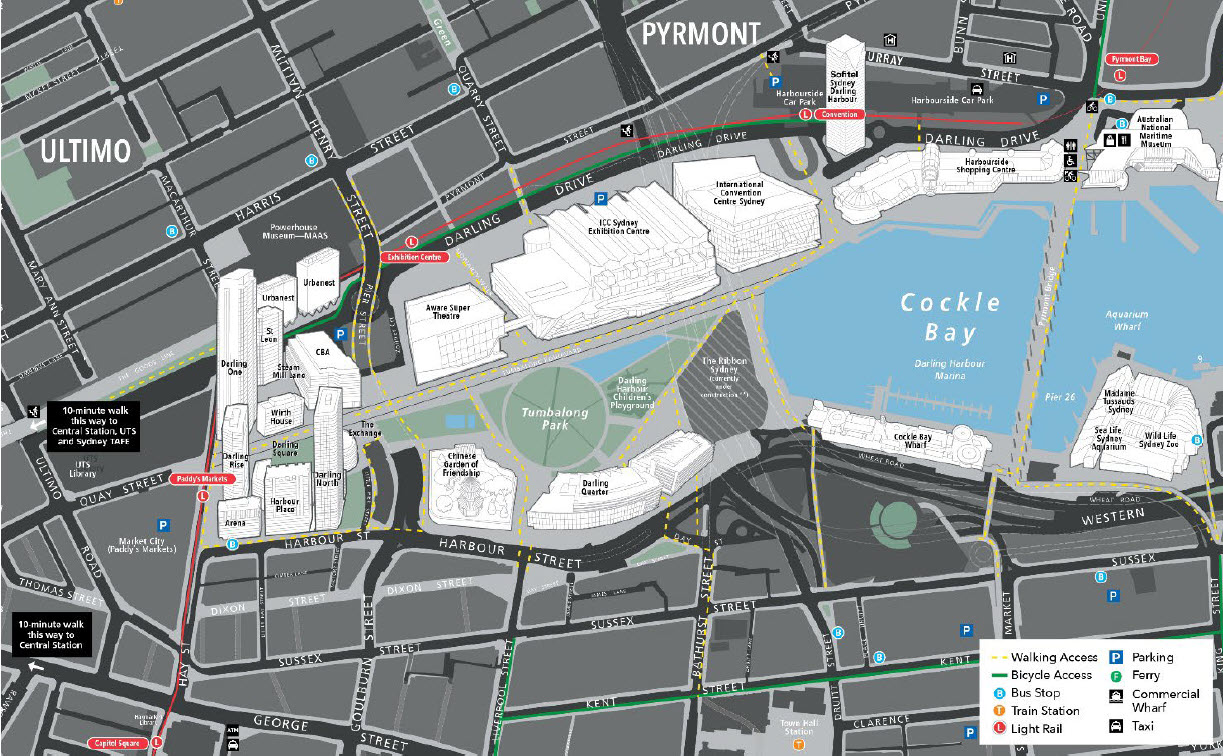 Situated at the intersection of Sydney’s academic, cultural and technology precincts, International Convention Centre Sydney (ICC Sydney) affords delegates, exhibitors and visitors convenient access to Australia’s most cosmopolitan city. The emerging financial, dining and retail precinct of Barangaroo is nearby; there are numerous galleries, theatres and concert halls within easy reach; and the bustling city centre is only a short walk away.